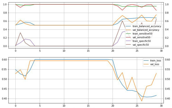 Getting in the trap and then getting out after machine learning epochs. “Cat vs. not-cat” problem on CIFAR-10, trained with VGG16 and the “broken loss” function (34). While in the trap, the machine takes every image for a cat (sensitivity = 1, specificity = 0 at threshold ).