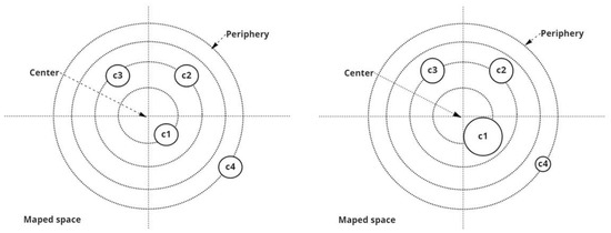 Representation of a “uniform” distribution (left) and a “dense” distribution (right). The size of the circles C representing the communities is proportional to the size of the community’s demand.