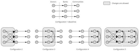 From a practical standpoint, considering network changes based on the supply chain levels is a straightforward way to segment network reconfigurations. Therefore, three possible reconfigurations (low, mid, and high level) are proposed with respect to the day-to-day solution (referred to as configuration 1). A low-level reconfiguration (configuration 4) corresponds to the case where only distribution decisions (banks to communities) are modified. Furthermore, the single-source assumption is relaxed, such that several banks are allowed to send food to the same community. The implementation of such modifications in practice is rather easy, as they involve coordination between two or among a low number of banks. In a mid-level reconfiguration (configuration 3), shipments of products between banks can be modified, but distribution decisions remain the same as in the day-to-day case. In a high-level reconfiguration (configuration 2), assignments of donors to banks can be modified. It is worth noting that banks are generally reluctant to allow others to interact with “their” suppliers. A bank would only be open to such a possibility if doing so would result in an important improvement in network performance. Finally, we also propose a full reconfiguration alternative (configuration 5), where all of the previous modifications are allowed. Figure 3 illustrates the reconfiguration alternatives.