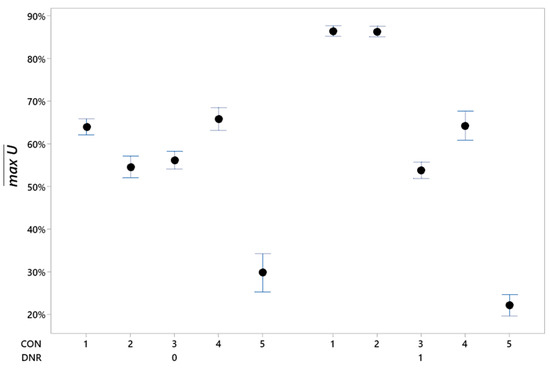 Figure 4 shows, for both levels of the factor DNR, the results for . It can be seen that when the resources were densely distributed (for example, DNR = 1), the results produced by configuration 2 were greatly deteriorated. The poorest performances were produced by configurations 1 (the baseline) and 4, which demonstrated that reassigning communities to banks alone is ineffective in the rebalancing of supply and demand in the case of a disaster.