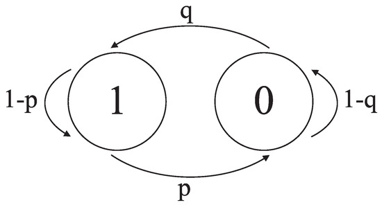 In this model, one of the states represents the occurrence of packet loss while the other state represents the alternate case in which the packets are successfully transmitted. The transition probabilities between state 0 and state 1, as shown in Figure 1, are represented by p and q. Specifically, state 0 means that packet is lost and state 1 means that packet is not lost. p denotes the probability of transitioning from state 1 to state 0, and q is the probability of transitioning from state 0 to state 1. The probability that n consecutive packets are lost is given by . If , then the probability of losing a packet is greater after having already lost a packet than after having successfully received one.