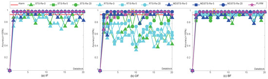 More details about the diagnostic results of the three healthy conditions under various packet losses can be found in Table 4 below. The computational accuracies of different transmission schemes are also shown in Table 5. The computational accuracy, indicated as , is defined as average ± standard deviation. The average accuracy is the average predicted value based on all transmissive datablocks. It is obvious that the more serious the packet loss is, the worse the performance of the competitive methods becomes, including greater time consumption and lower accuracy. Even if they can detect the faults in several cases (marked with * in Table 4), they are largely unstable. As shown in Table 5, the performance of STS, RTS and MDSTS are significantly unstable, whereas the results of PLIRM are more reliable and rapid for different packet losses under the condition of bearing outer faults. Due to the establishment of the dynamic retransmission scheme based on ZPPL and combining MMD, this phenomenon is significantly improved, which can be observed in Table 4 and Table 5. The time costs of STS, RTS and MDSTS remarkably increase with escalating packet loss. However, more importanly, PLIRM can always accurately detect faults in a timely manner.
