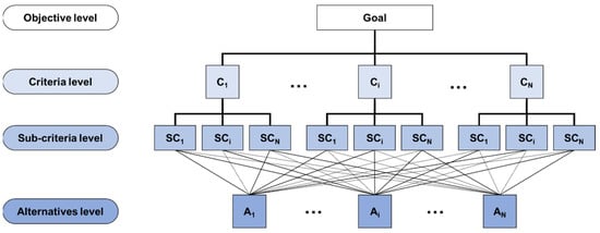 Let us very briefly recall that the AHP is a multicriteria decision-making tool. According to the AHP, the general objective to be met is defined first, followed by the criteria to achieve this objective, the possible sub-criteria into which the criteria can possibly be broken down, etc., up to the lowest level of the hierarchy, or alternatives that must be prioritized (see Figure 2).