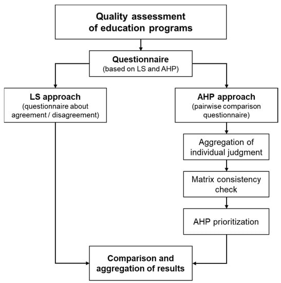 In order to better analyze a generic training service, Grönroos (1988) [47] proposed the following specific criteria: professionalism and competence, attitude and behavior, accessibility and flexibility, ability to repair an error, reputation and credibility of the operator, reliability and trust. Parasuraman et al. (1985) [48] classified measurable variables in order to standardize the dimensions of perceived quality: tangible aspects, reliability, responsiveness, competence, courtesy, credibility, safety, accessibility, communication, understanding. In this work, dimensions defined based on those proposed by Grönroos (1988) and Parasuraman et al. (1985) were used together with numerical scales, in accordance with Saaty’s works [3,49,50], to quantify and compare the obtained results. This study extends our previous conference contribution [4] by widening the methodological aspects of the work and clarifying how the two proposed techniques (AHP and LS) are combined together. More specifically, an LS was used since it provides a well-known and versatile tool to assess user satisfaction, and, in our study, it was used to represent the degree of satisfaction of the learners with respect to the training courses; meanwhile, the AHP, among other multicriteria decision-making methods, appears to be more often applied to healthcare-related problems, also with some applications to medical education, and, in our study, we used it in combination with the LS to prioritize the improvement actions to enhance the quality of the training courses provided. Thus, in this manuscript, the hybrid and generalizable approach is described in depth from both a theoretical and practical perspective, the proposed novel workflow is presented and each step of the procedure is detailed. In addition, further results obtained by applying this hybrid approach to the real scenario are presented and widely discussed, and an extensive interpretation of the achievements is provided and discussed in view of the impact that the generalization of this approach could have on the medical training field and, more generally, in the quality assessment of education programs.