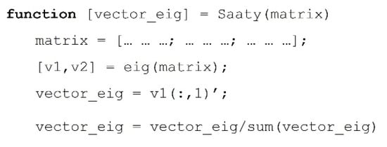 The data contained in the pairwise matrix (Table 4) were used to derive the order of the pairs between the elements of each matrix, i.e., a scale of values that expresses the final choice of priorities. The priority scale is a scale obtained using the eigenvalue method proposed by Saaty [3], and, here, it was implemented by developing a straightforward algorithm in the MatLab environment (Figure 4).