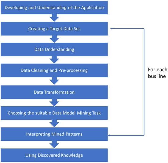 To achieve our goals, we propose a model based on KDD and CRISP [55]. This model is shown in Figure 4 and its steps are explained below. Although this model can be used to independently address each of the transport means we want to predict, as a use case we have taken a single bus line.
