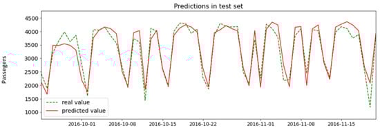 This is the last and final step of the KDD process where the discovered knowledge has value for different use cases. In Section 4.6, we obtained an LSTM model that predicts passenger demand as can be seen in Figure 8 with good accuracy (R2 train = 0.92, R2 test = 0.89) and also as seen in Section 4.7 the model can be interpreted through rules from the business point of view with good precision (R2 train = 0.95, R2 test = 0.95). Therefore, we qualitatively know the reason for the prediction.