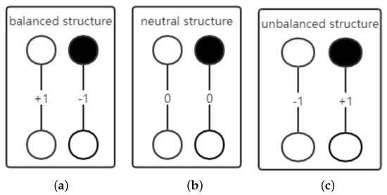 In this investigation, we introduce an edge named neutral edge (“0”), which is a neutral status between positive and negative edges. It refers to a kind of edge without a clear position, which means that the connection between nodes is not clear or neutral. After introducing the neutral edge, we propose a binary motif in a signed network, firstly. Three types of the binary motif are shown in Figure 1. Specifically, two nodes share the same attitude; at the same time, the signed edge between the two nodes is positive; then, we say the binary motif is balanced. If two nodes share an opposite attitude, and the signed edge between i and j is positive, then the binary structure is unbalanced. Based on the above analysis, a binary group includes two parameters, one is the nodes’ opinion and the other is the edge sign between the two nodes. A neutral edge (“0”) means that there is no clear connection between two nodes. However, in the dynamic evolution process, the neutral edge has the opportunity to evolve into negative or positive, due to the constraints of structural balance.