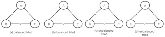 Figure 2a,b denote a balanced triadic structure, Figure 2c,d denote an unbalanced triadic structure [2]. If the product of signed edges in each cycle is positive, the signed graph is balanced [16]. If each triad in a signed complete graph is balanced, then the signed graph is balanced. Here, since we consider the chance of a tried with , a “neutral triadic motif” is introduced, for the case, the product of three sides in a triad is 0.