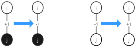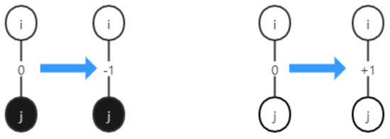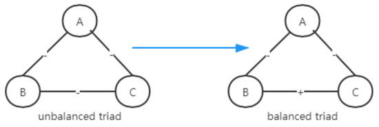 The rule for the evolutionary of a positive edge is shown in Equation (7) and Figure 4. When the attitude of two nodes is the same, and the edge is positive, there is a balanced structure between them. If the attitudes of two nodes are opposite and the edge is positive, in order to make the approach a balanced structure, minus (the strength of change to ), and , the positive edge evolves into negative.