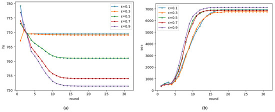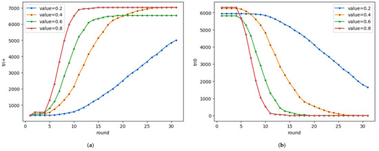 In Figure 9, we plot the impact of the control parameter on the final network balanced triad and triad 0 (neutral triads). We observe that when is larger, the number of balanced triads increase rapidly in Figure 9a. Moreover, neutral triads decrease rapidly in Figure 9b, When , a large number of neutral triads still exist after 30 rounds of evolution, it shows that the network has not reached structural balance. It can be concluded that in the process of approaching a balanced structure, it is more difficult to change the opinion than to change the edge.