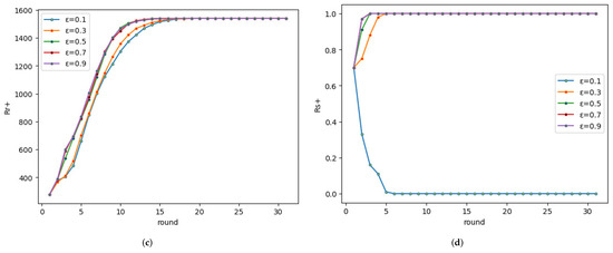 As shown in Figure 6a–c, when is large, the weighted signed network has the fast velocity to approach structural balance, the number of balanced triads and positive edges in the same round is the largest. The reason is that the larger promotes nodes interacting with others, thus promoting consensus. As shown in Figure 6d, all nodes hold the positive opinion, as long as . According to the binary structural balance, because all opinions are positive, all edges are positive in the end, and the proportion of balanced triads is also higher. Based on the above analysis, we can conclude that the larger the is, the faster the network approaches the structural balance.