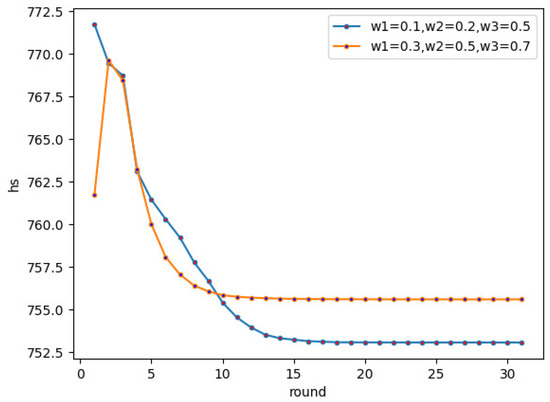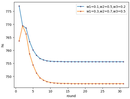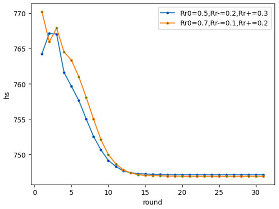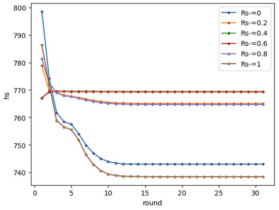 The second experiment was to observe the transformation of neutral edges into negative and positive ones. As shown in Figure 11, when and , the network approached a balanced state after 10 rounds. This experiment’s results show that the strength of the neutral edge has a small influence on the structural balance. Because the neutral relationship implies that there is no clear relationship between two nodes, it is easier to convert the neutral edge to a positive edge or negative edge.