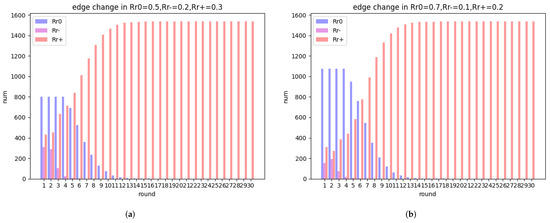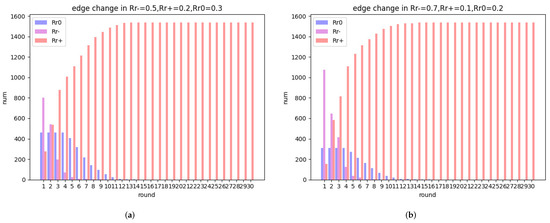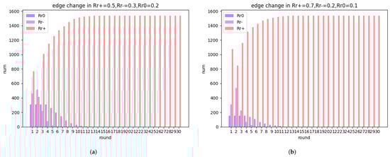 By observing Figure 20a, we can see that both the number of neutral edges and negative edges decreased gradually before 10 rounds. This dynamic resulted in the gradual increase of positive edges. By observing Figure 20b, we can see that the number of neutral edges did not change in the first and second evolution rounds. However, from the third round, the negative and neutral edges began to decrease. These experimental results show that the probability of the neutral edge evolving into the positive edge was greater than that of the negative edge. The probability of structural transformation in Figure 21a is greater than that of Figure 21b. Since the network is toward a structural balance.