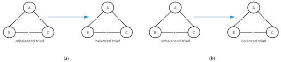 Changes of positive edge: (a) the edge between nodes B and C evolves from to ; (b) the edge between nodes B and C evolves from to .