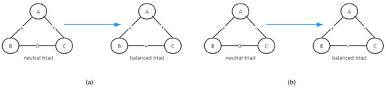 The rule for the evolution of a neutral edge is formulated in Equation (8) and illustrated in Figure 5. No matter whether the attitudes of the two nodes are opposite or consistent, the neutral edge may evolve into a positive edge or a negative edge. When two nodes have the same attitude, to make the binary motif approach the balanced state, the neutral edge needs to evolve into a positive edge, which affects add (the strength of change to ). If two node opinions are opposite, in order to make the edge evolve into a negative edge, concerning the social influence weight , subtract (the strength of change to ). always falls into the range of .
