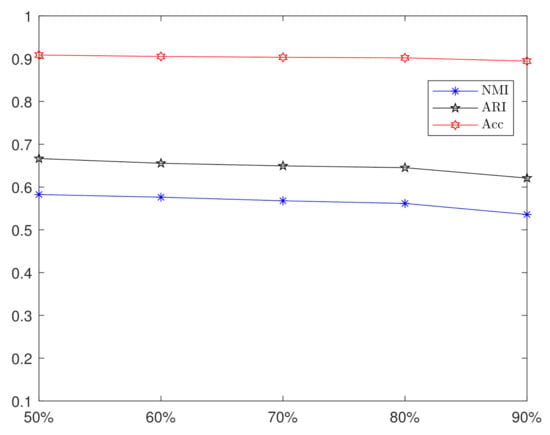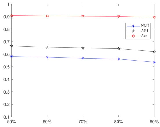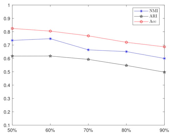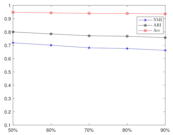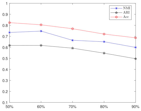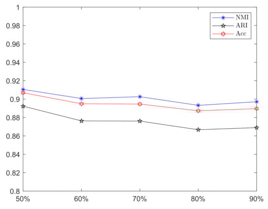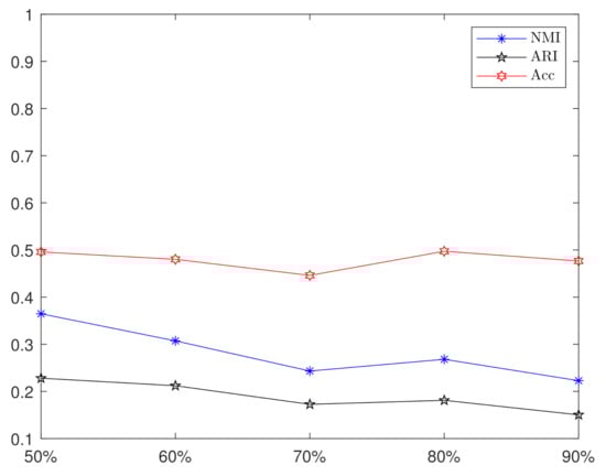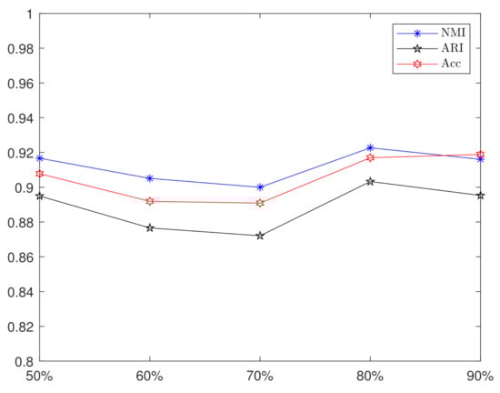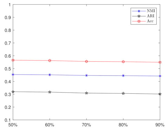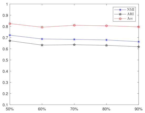 The TWCE strategy uses a traditional clustering algorithm on parts of the features to obtain the base clustering results. The percentage of the selected feature subsets will have an impact on the performances of the experiment. In this subsection, we discuss the relation between the clustering performances and the percentage of the selected feature subsets. We also use the datasets in the previous subsection and the percentages of the feature subset are set to 50%, 60%, 70%, 80% and 90% of a dataset when the ensemble size is 50. The average value, value and value are achieved by running the TWCE algorithm 30 times, which uses the K-means algorithm and the NJW algorithm to generate base clusters on all datasets, respectively. Figure 2, Figure 3, Figure 4, Figure 5, Figure 6, Figure 7, Figure 8, Figure 9, Figure 10, Figure 11, Figure 12 and Figure 13 list the value, value and value of twelve datasets from the TWCE strategy based on K-means when the percentage of the feature subset takes different values. Figure 14, Figure 15, Figure 16, Figure 17, Figure 18, Figure 19, Figure 20, Figure 21, Figure 22, Figure 23, Figure 24 and Figure 25 show the relation between the clustering performances and the percentage of the feature subsets selected by the TWCE strategy based on the NJW algorithm.