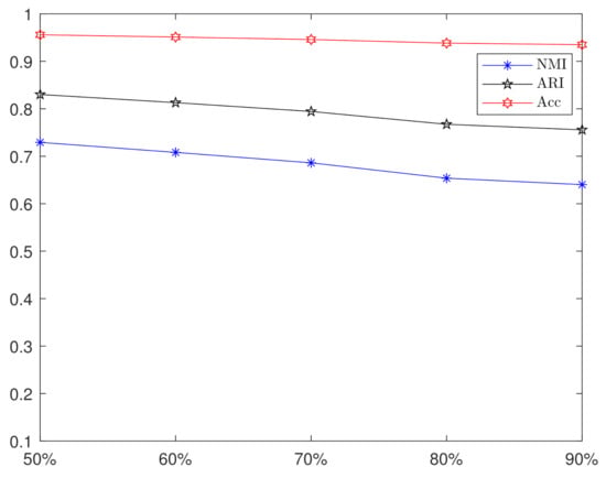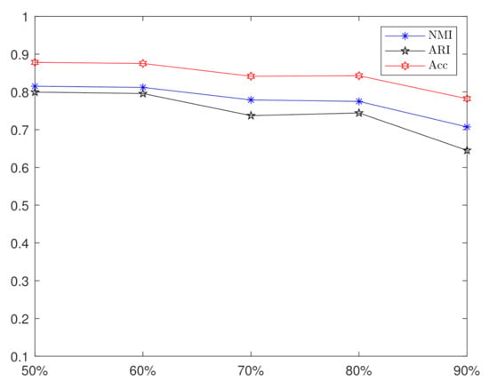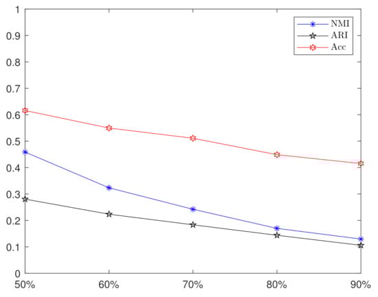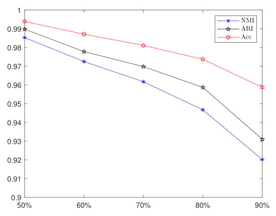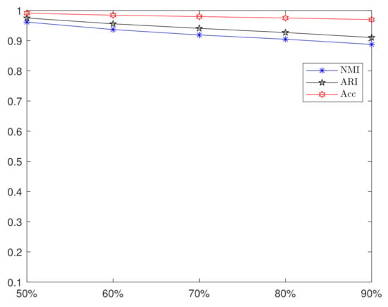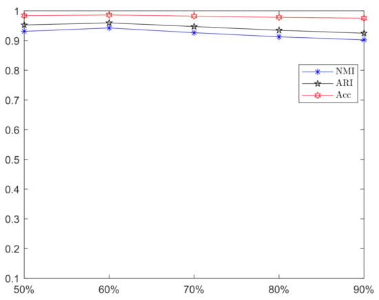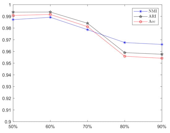 - Normalized Mutual Information ()where X is the test label, and Y is the real label. and represent the entropy of X and Y, respectively. is the mutual information between X and Y.