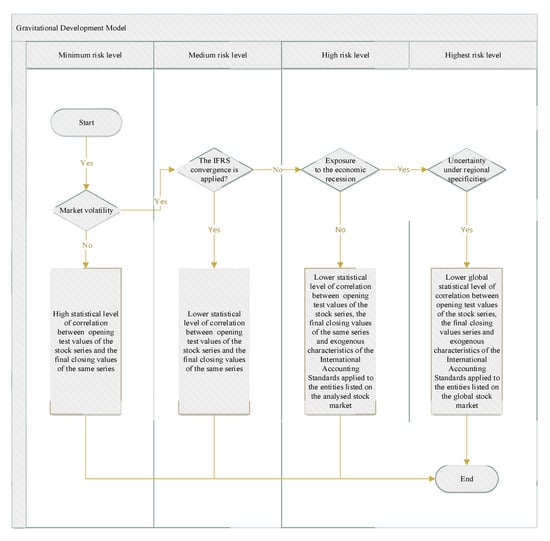 A pragmatic fair value approach to risk was performed by [12] in a seasonal system using an econometric model that highlighted vulnerability in relation to certain elements, such as capital recognition, increased leverage and the excess physical capitalisation of the entity. In the author’s opinion, the USGAAP system needs to be made more flexible in terms of fair value, which only contributes to risk identification through its regulatory role and omits both the informational component and the possibility of linking fair value volatility (capital recognition) to investment security. From this perspective, we aimed to identify the evolution of the US financial market in terms of USGAAP regulations relative to other financial markets, thus determining the vulnerabilities of economic capital recognition according to the gravity model of economic development.