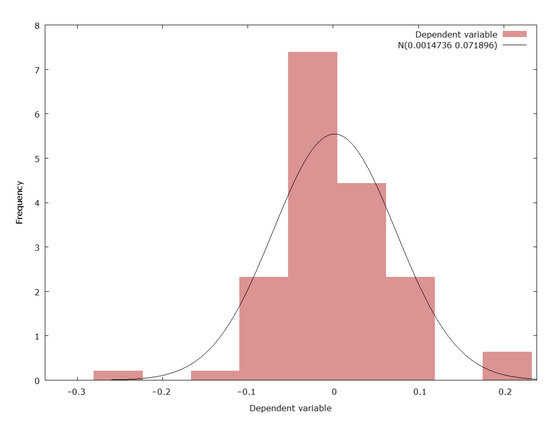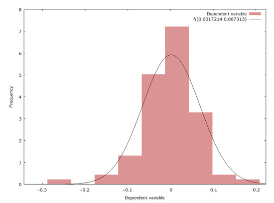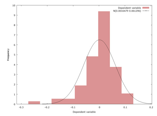 According to the normal distribution of the dependent variable in relation to the Gauss curve, there was a slight flattening to the left of the graph, which indicated the clustering of errors in the negative area relative to the median. This reflected the fact that volatility increases as stock prices decrease and vice versa. At high prices, there is inertia in the system towards volatility, which is induced by the internal or external risk of economic capital recognition (through USGAAP support) (see Figure 4).
