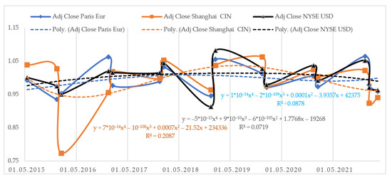 The analysis was based on a database that was constructed according to the monthly quotes of the three stock exchanges, which were chosen using [44,45,46]. The absolute data were processed to ensure comparability and monthly trends were determined according to the following formulae: