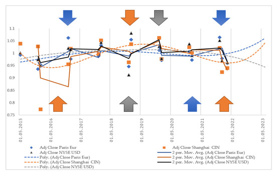 The evolution of the composite index for the Shanghai, Paris and New York Stock Exchanges. Source: [47,48,49].