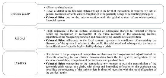 For H2, i.e., the vulnerability levels are closely related to the exogenous characteristics of the International Accounting Standards that are applied to the listed entities on the analysed stock market, the matrix size of the model was tested for exogenous characteristics that were connected to the regional economic reality of the stock market, for which the following main characteristics were identified: China’s economy needed the increased rigor due to the global size of Chinese trade; the US economy operated on the principle of a connection between taxation and accounting; and the European economy was, by definition, a competitive economy in a common market.