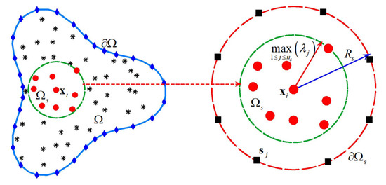 where is the distance between the ith node and jth nodes in the local domain, and R > 1 is usually called the scaling factor that can be given randomly in a considerable range. In this work, R = 10 is chosen for simplicity; thus, an artificial circle or surface centered at ith node can be generated with radius Rs. Equation (6) can be rewritten as