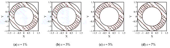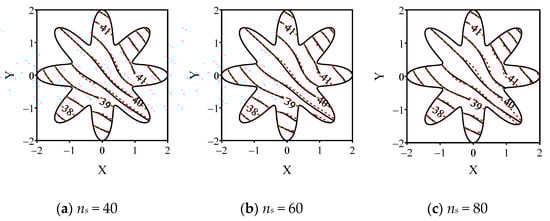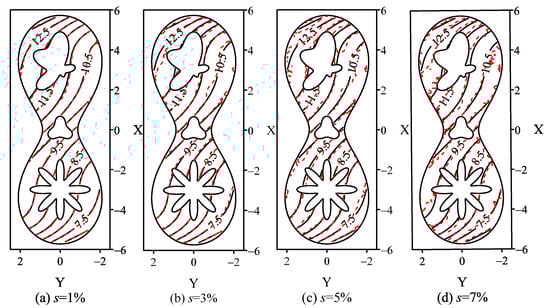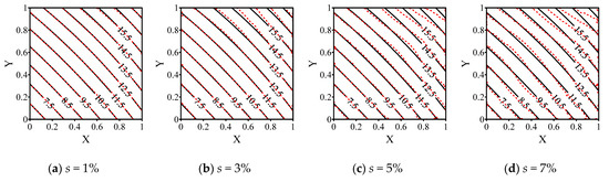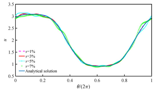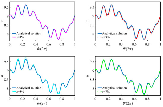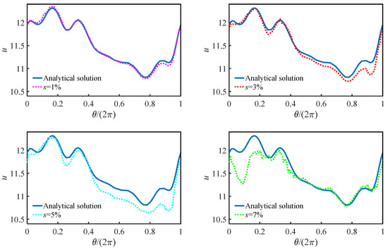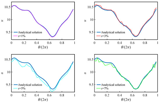 Firstly, N = 3259, and ns = 120 is used to test this inverse Cauchy problem. In Figure 7, the black solid contours represent the analytical solution, and the red dashed contours represent the numerical solution. Since the noises are given on boundary , the red dashed curves are unstable near the outer boundary in Figure 7, especially when the value of s is large. When s = 1%, the numerical and analytical solutions are almost close to each other in Figure 7a. When s increases to 3%, 5%, and 7%, the deviation between the numerical and analytical solutions keeps increasing. Meanwhile, due to the missing boundary conditions of boundary , the maximum deviation always appears on the outer boundary. Therefore, the details of numerical and analytical solutions on the boundary are shown in Figure 8, where θ is the angular coordinate of the outer boundary node in the polar coordinate system. From the Figure 8, we can see that the deviation between numerical and analytical curve increases when the value of s is enlarging, and a large deviation can always be found when the value of u is large.