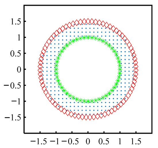 Therefore, the inhomogeneous problem described in Equations (1)–(3) can be changed to a higher-order homogeneous problem in Equation (4) with the boundary conditions described in Equations (2), (3) and (5). It should be noted that the new added boundary conditions are put along all the boundaries. Then, the homogeneous solution can be obtained directly by the LMFS. In order to illustrate the specific operation process of the RC-MRM, we propose a simple example below. If the original inhomogeneous governing equation is , when we set , a new homogeneous governing equation can be easily obtained. Moreover, the new boundary condition of the whole boundaries is added to ensure the uniqueness of the solution.