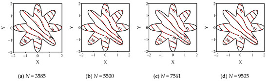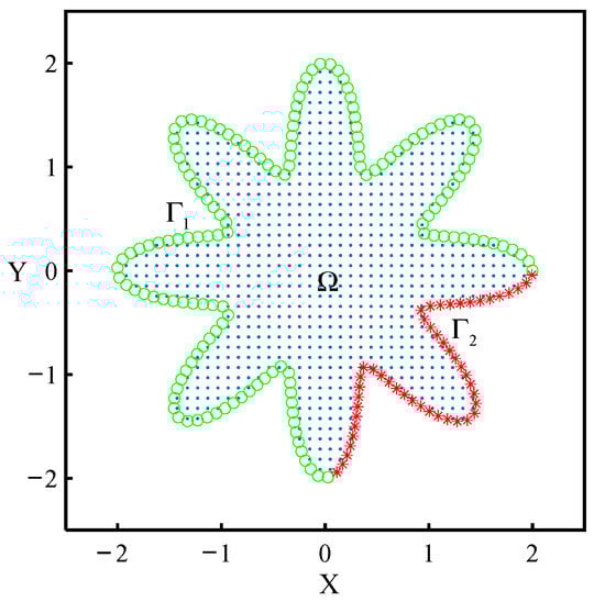This example introduces another inhomogeneous problem in an irregular multi-connected domain, as shown in Figure 9. For some engineering problems, the boundaries of hidden holes are irregular, and their boundary conditions can be hardly measured. The multi-connected domain , which is the same as what was used in [32], is composed of a symmetrical outer boundary and three irregular inner boundaries , and . The parametric equations of the irregular boundaries can be defined as follows,