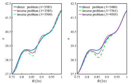 In this part, an inhomogeneous inverse problem without an analytical solution is proposed. The mixed Dirichlet and Neumann boundary conditions are given in this problem. It should be emphasized that, in order to simulate the engineering problems, the two kinds of boundary conditions can neither be derived from each other nor meet the governing equations. The inverse Cauchy problem was proposed recently by Fan et al. [33], which can be introduced as two steps: the direct problem and inverse problem. Then, the details of the irregular boundary are shown in Figure 14, where represents the angles of polar coordinates of the boundary nodes. The formulas of the boundaries are presented as follows,