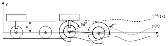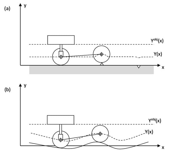 The vertical actuator (between the actuated or rear wheel and the sprung mass) has to maintain the latter at the objective height. In this approach, the objective height is the result of the moving average of the calculated height over the rolling distance 2D. Actually, the larger this distance, the softer the objective function, but also the bigger error is accumulated in calculating the height from the accelerometer reading. Thus, parameter “D” should be adjusted according to the kind of roughness the topography has (with the sole requirement not to exceed the distance between wheels).