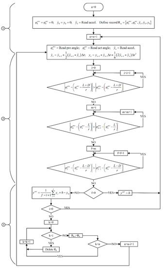 At time t = nΔt, the vertical acceleration of the probe wheel,, and the angles turned by the wheels, are measured. Then, the velocity, , and vertical position, , are calculated by using Equations (18) and (19), respectively. All these values are recorded in a database in the way indicated in Table 3.