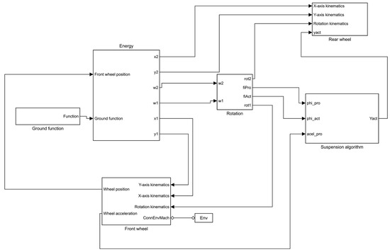 The models described above to define the kinematics of the 1/2 vehicle and the suspension algorithm are implemented in Simulink, and more specifically, in Simscape. The main diagram is shown in Figure 8 and is composed of six big blocks. The input block is the “Ground function” block, which defines the parameters of the trajectory that the vehicle must follow. The “Energy” block performs all the calculations (Equations (1)–(13)) to compute the kinematics of the half vehicle model. Front and rear wheel blocks contain the relationships between the wheel bodies and the main reference frame of Simscape. The rear wheel block also has the actuator to move the sprung mass according to the commands given by the suspension algorithm. The computation of the rotation angles turned by both wheels is carried out within the rotation block. Finally, the block “Suspension algorithm” performs all the calculations (Equations (14)–(21)) to actuate the sprung mass.