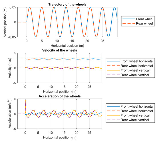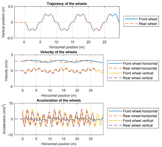 The results obtained from the simulation of the second ground profile are shown in Figure 13, Figure 14, Figure 15 and Figure 16. Figure 13 displays the kinematics of both wheels of the 1/2 vehicle. As in the previous case, the trajectory of both wheels follows the input ground profile as expected. The speed varies according to the topography of the ground profile and the energy conservation. Velocity variations are slower on the horizontal axis than on the vertical axis, where the velocity is more sensitive to profile variations. Similar behavior is noticed in the accelerations, being the vertical accelerations larger than the horizontal ones.