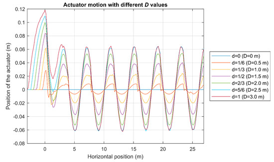 As is described in Section 2.2, the algorithm’s key parameter to define the motion of the sprung or actuated mass is the distance “D”. This parameter is set from D = 0 m (no actuation over the sprung mass) to D = 3 m (the vehicle’s wheelbase) in steps of 0.5 m. Hence, seven values of “D” were tested.