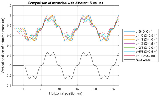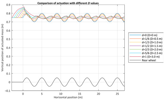 Figure 11 shows the path followed by the center of the rear wheel and the position of the actuated mass for a better comparison of the followed trajectory and the actuation of the suspension system. It is observed that the movement of the sprung mass is the opposite of the rear wheel when the parameter “d” is larger than 2/3, that is, when the distance “D” over which the moving average is computed is larger than 2 m. In this situation, when the rear wheel moves upwards, the sprung mass is moved downwards, and vice versa. For values of parameter “D” below 2 m (d < 2/3), the sprung mass moves vertically in the same direction as the rear wheel, but this movement is limited.