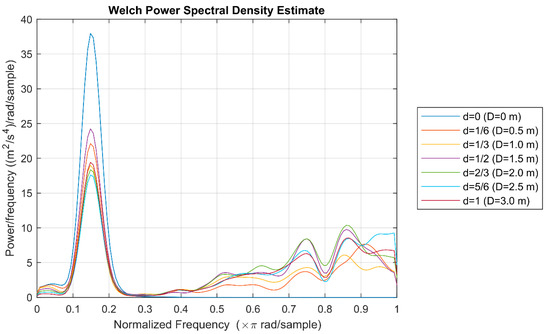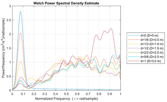 Once again, to make easier the search for the optimum value of parameter “d”, the maximum amplitude and the RMS of the spectra are summarized in Table 6. Combining the spectra and the numbers in the table, it can be concluded that the best value for parameter “d” in the conditions of this simulation is d = 5/6, as it achieves the lowest maximum amplitude and RMS values. The normalized parameter d = 5/6 means that the distance “D” is equal to 2.5 m.