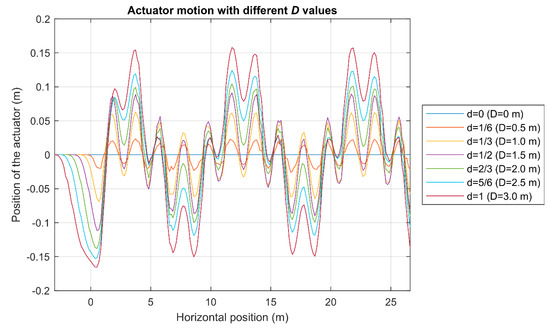 The displacement of the actuator is plotted in Figure 14. As it can be seen, the actuator does not move when the value of the parameter “d” is zero. Once the simulation begins, the actuator starts to move in compression (negative displacement) to compensate initial descent of the vehicle. As it happens in the first set of simulations, the larger the value of the parameter “d”, the larger the displacement of the actuator. The use of the largest values results in an actuation that clearly highlights the two harmonics that compose the second ground profile.