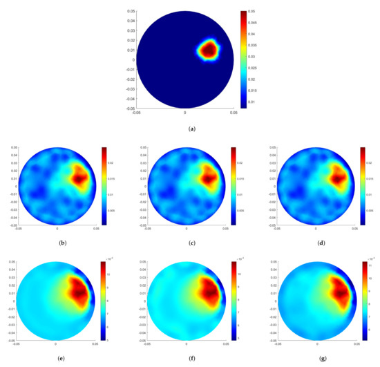 The inclusion is located at the right and side of the domain, close to the boundary. Reconstructions from the TV-MMIRGN are shown in Figure 2b–d. Figure 2e–g show the reconstructions by the IRGN method after iterations using an initial regularization parameter of . Reconstruction errors between the two methods are provided in Table 2. This is relatively better posed reconstruction since the inclusion is closer to the boundary than at the center. Therefore, IRGN performed relatively well, but the proposed methods performed better in terms of resolution of the inclusion. This is illustrated in the reconstruction with TV-MMIRGN in this example where we obtained an inclusion of higher quality, and the background is more clear and closer to the true solution shown in Figure 2a.