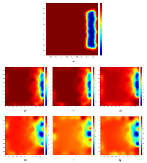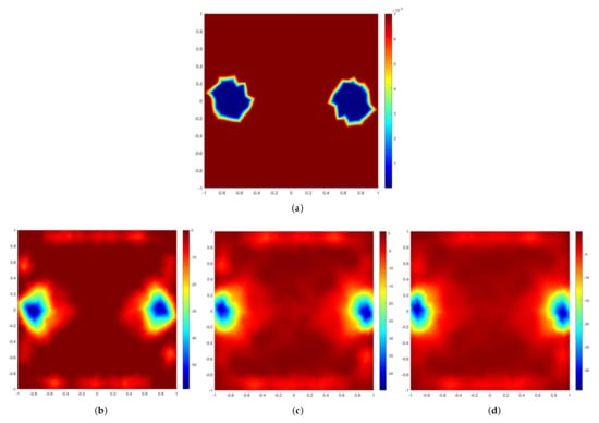 In this section, we present some numerical examples to illustrate the performance of the methods discussed in the previous sections. First, we describe the experimental setup; we present the reconstructed electrical conductivity distribution in a simulated circular geometry where we choose , of radius m and the number and location of the targets of interests varies. To compute the solution of the forward problem for a known conductivity distribution , we use the finite elements method [,]. We discretize region into triangular elements, and then we add random Gaussian noise into the data to contaminate them to simulate errors that typically stem in a realistic situation from a variety of sources, for instance, rounding errors or inaccuracies in the measurement process. Noisy simulated data are obtained pointwise by adding standard Gaussian errors into the data as follows: