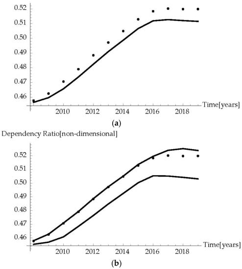 Dependency ratio for Spain in the 2008–2019 period: (a) Deterministic validation, R2 = 0.999246, relative error < 1.606; (b) Stochastic validation.