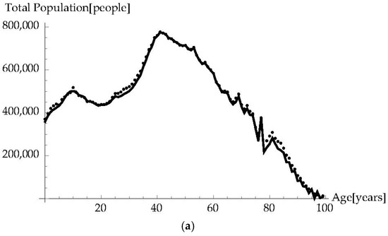 Finally, population structured by age is wrong in the database used [11]. In the work presented by Sanz [19], it is observed that there are errors in the validation trials being performed that can be corrected if a population structured by age is built from the other existing data presented in the same databases used. Concretely, the populations structured by age that [11] provide us differ greatly from the corresponding populations calculated from births, deaths, and historical migrations (structured by age) also provided by [11]. For this reason, in the present work, the population structured by age has been calculated previously as Sanz [19]. Two steps are followed to calculate the populations in the different years: (1) the initial population of reference is taken as that of the beginning of the period, in our case, the population of the year 2007 (Equation (13)); and (2) the population in year t and cohort x are calculated as follows in Equations (14) and (15),