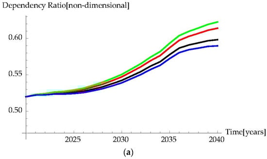 Simulated dependency ratio for Spain in the 2020–2040 with four different strategies: black (SS1), red (SS2), green (SS3), and blue (SS4). (a) Deterministic Formulation, (b) Stochastic Formulation SS4.