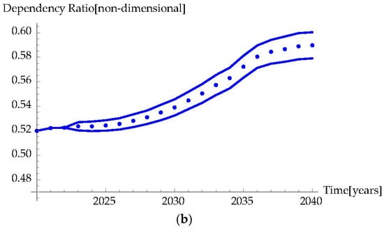Figure 5 shows that to reduce the dependency ratio, i.e., to get more people in working ages with respect to those in non-working ages, it is necessary to apply Strategy SS4, that is, to modify the trend of the demographic control variables on those terms: increasing the birth and immigration rates and reducing the emigration rate. More details about the stochastic formulation results, with a 99% confidence interval, are shown in Table A3 of Appendix A.