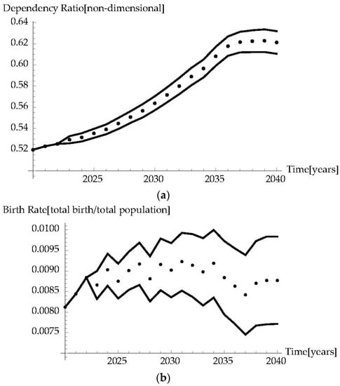 - Simon, C.; Belyakov, A.O.; Feichtinger, G. Minimizing the dependency ratio in a population with below-replacement fertility through immigration. Theor. Popul. Biol. 2012, 82, 158–169. [Google Scholar] [CrossRef] [PubMed]