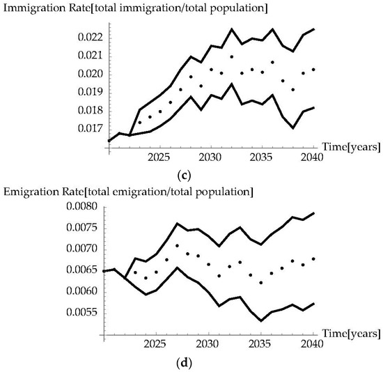 Results of the genetic algorithm for Spain in the 2020–2040 period: (a) Dependency Ratio; (b) Birth Rate; (c) Immigration Rate; and (d) Emigration Rate.