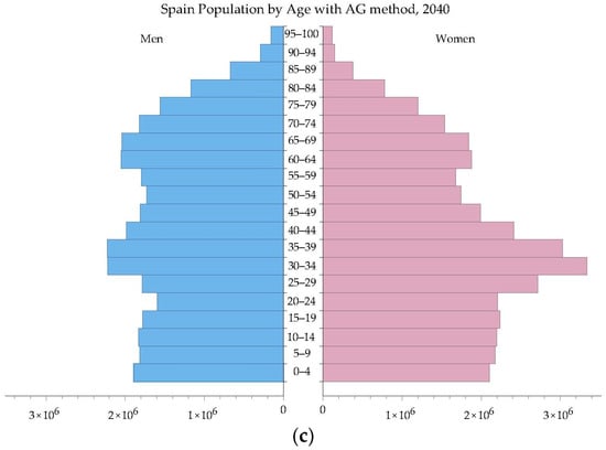 Spain population structured by Age: (a) Spain in 2019, real data input variable; (b) Spain in 2040 through Strategies and Scenarios method; and (c) Spain in 2040 through Genetic Algorithm.