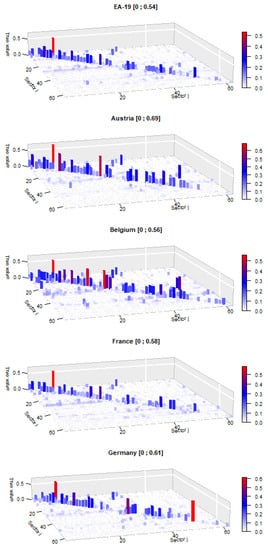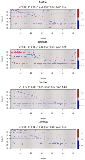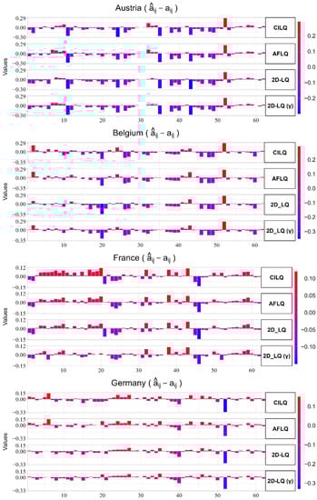 The above formulas provide corrective effects on a frame of reference. Unless specialists in this field of work are able to make an intuitive guess, it is difficult to ascertain which estimation errors are made when applying one LQ formula or another. In this regard, it is considered appropriate to illustrate the projections that would incur a null error, cell by cell, for four EA-19 countries, namely Austria, Belgium, Germany, and France. As an example, the calculations for Austria are available as a Supplementary Materials. In this regard, we downloaded a Eurostat database (see Supplementary Materials: Projection via LQs for Austria 2015) table (https://ec.europa.eu/eurostat/web/esa-supply-use-input-tables/data/database, accessed on 25 March 2020) containing the symmetric matrices of total flows for 2015 at basic prices, 64 × 64 product per product [naio_10_cp1700]. While these four countries have different productive dimensions, they may be conducive to detecting possible common patterns. To include more countries would imply a perhaps too extensive development, although some more could be selected given that almost all accounting frameworks are available.